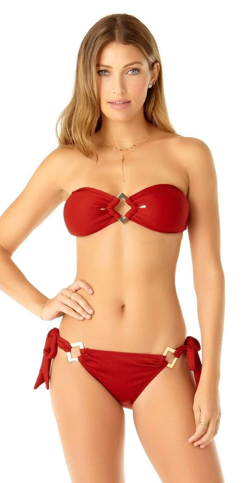 The Anne Cole Studio Tie Side Bikini Bottom is a tie side full coverage bottom. This all red bottom has ribbed fabric and gold metal squares at the side for a super luxurious style. Pairs perfectly with the Oh My Goddess Bandeau Bikini Top