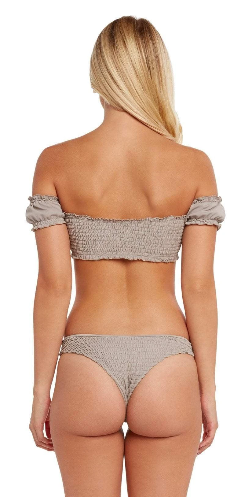 The Chloe Rose Honey Bikini Set is a smocked off the shoulder top with bow detail at the center bust and a matching smocked bottom that is cheeky and chic. This top is a pullover style with no cups. The bottom sits just above the hips and offers cheeky coverage.