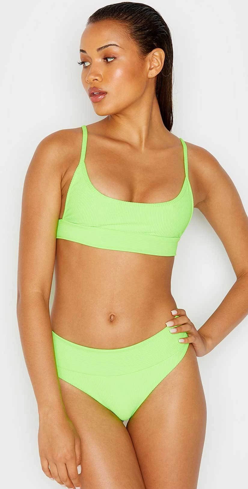 The Frankies Bikinis Gavin Bikini Bottom is a high waist cheeky bottom in a soft ribbed fabric that’s a bright neon green. This flattering and sexy bottom offers cheeky coverage.