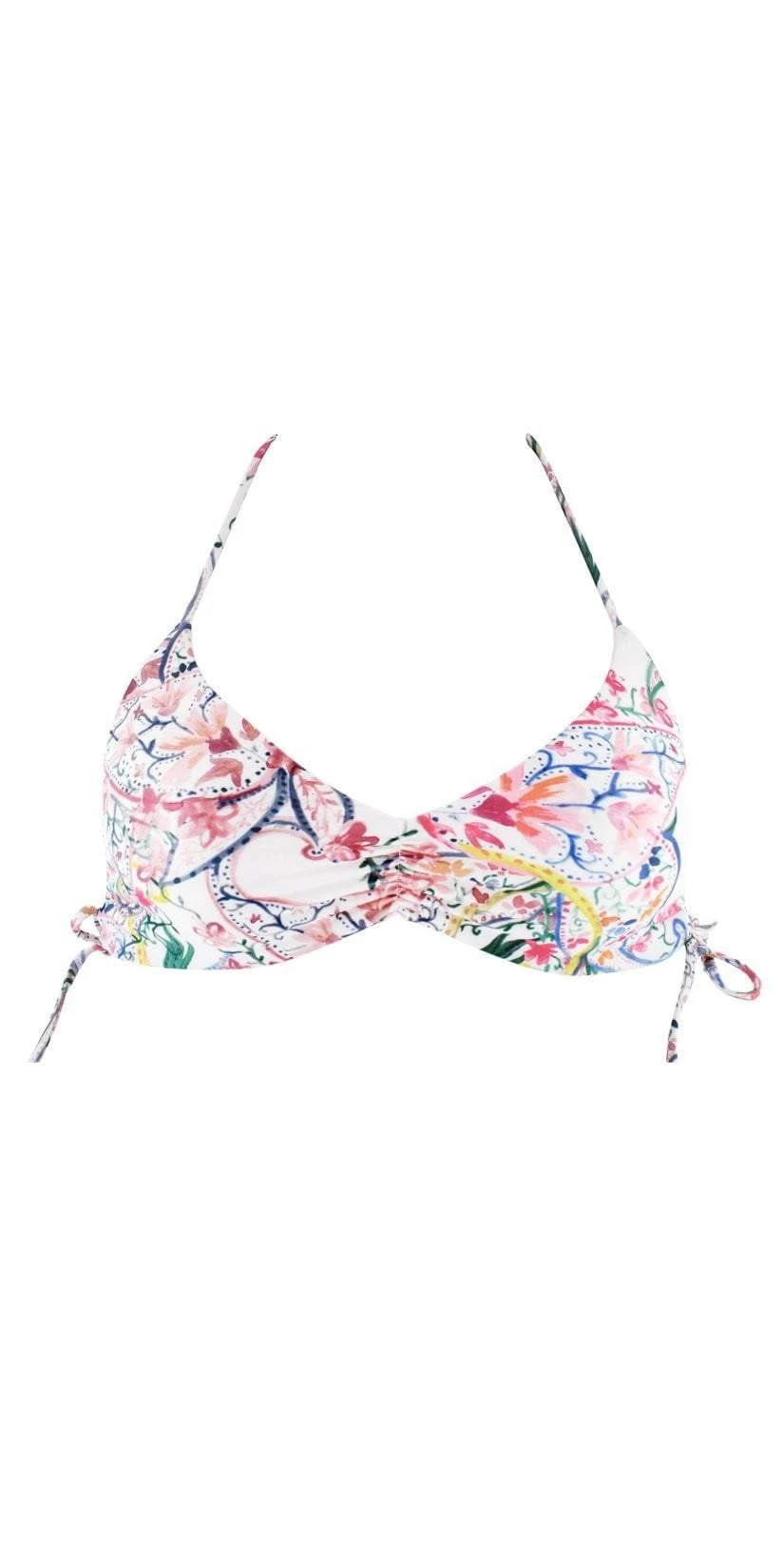 The L Space Gwen Top in Paisley is a vibrant bralette-style top with sexy side lace-up details that are adjustable. This super sporty top is a pullover style with a ruched v neck that ties at the neck and pairs with the L Space Ella Bottom!