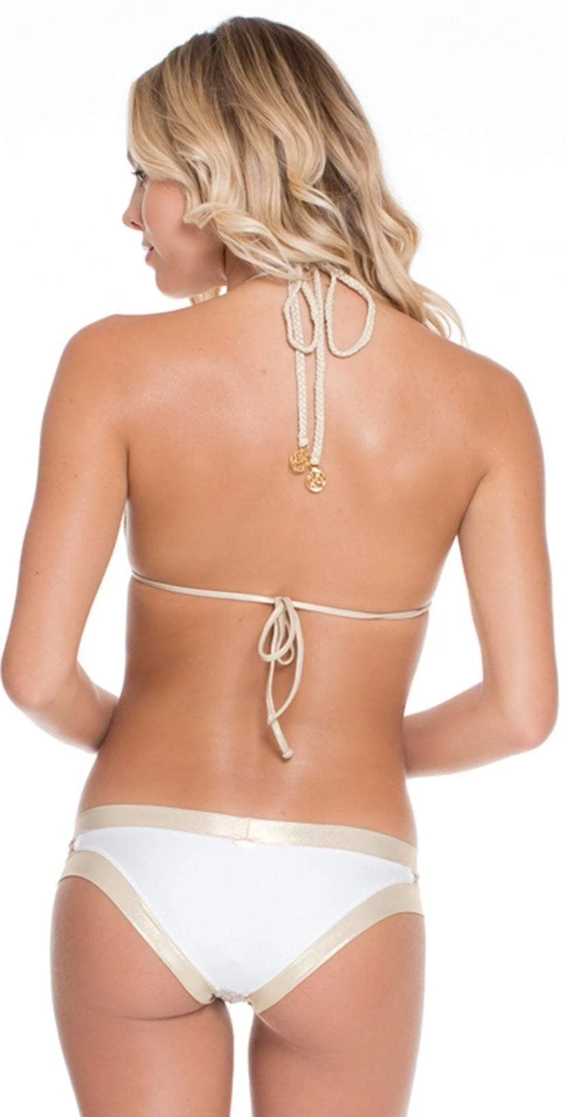Get your shimmer on in the Luli Fama Desert Babe triangle bikini top. This top offers gold metallic fabric with a textured net overlay, braided halter straps that tie around the neck and solid gold metallic back straps that tie to close. Pair with the matching bottoms HERE