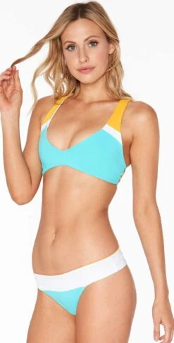 This Malai High Neck Top in Rośe features a high neck, lace up detail in front and side boning for added support. This top crosses in back and ties at mid back for the perfect fit. Pairs with the matching Awe Fishbone Rośe Bottoms.