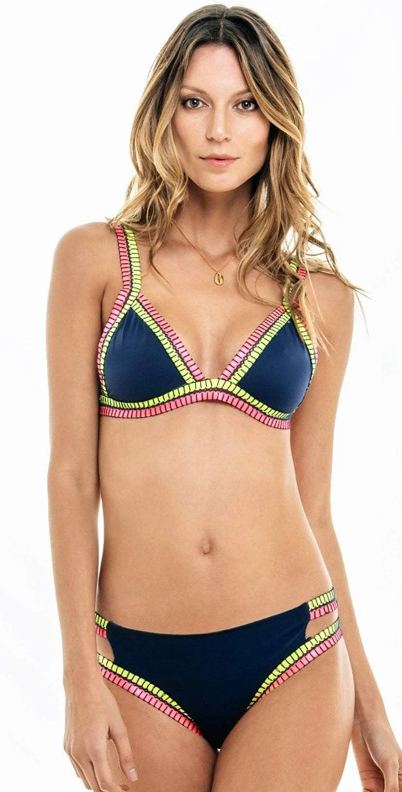 The Milonga Basic Blue Bikini is a dark blue fixed triangle top with lime green and pink hem with navy blue stitching detail. This top features adjustable over the shoulder straps and ties at the back for the perfect fit. The bottoms offer a cut out double strap hip with the same stitching detail.Â