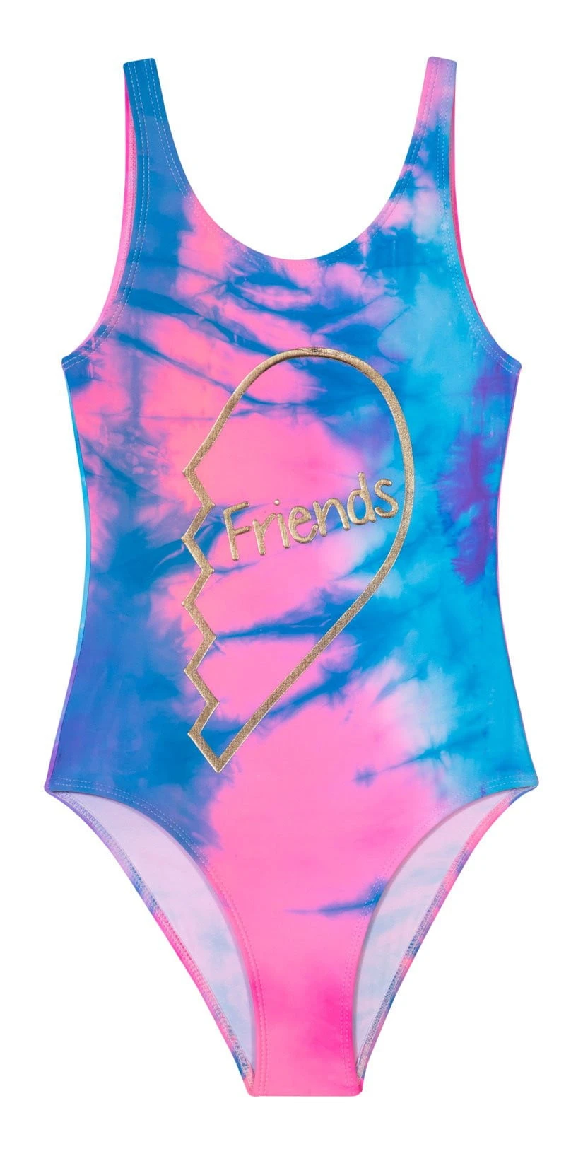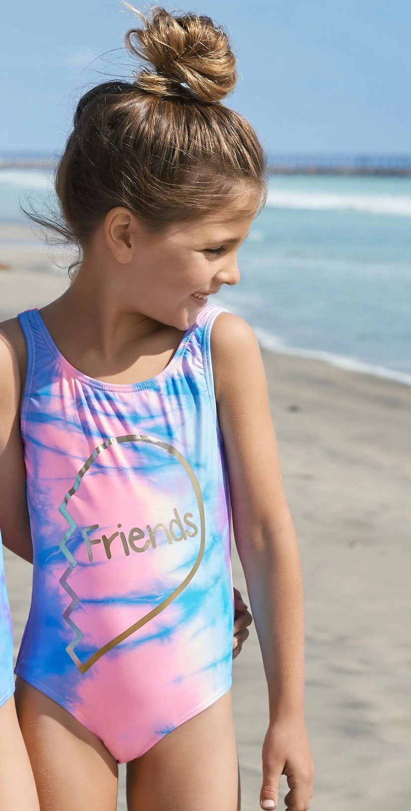 The PilyQ Girls Golden Best Friends One Piece Friends Side is the friends side to the best friends matching swimsuits. This pink and blue tie dyed one piece is the perfect match to your best friend!
