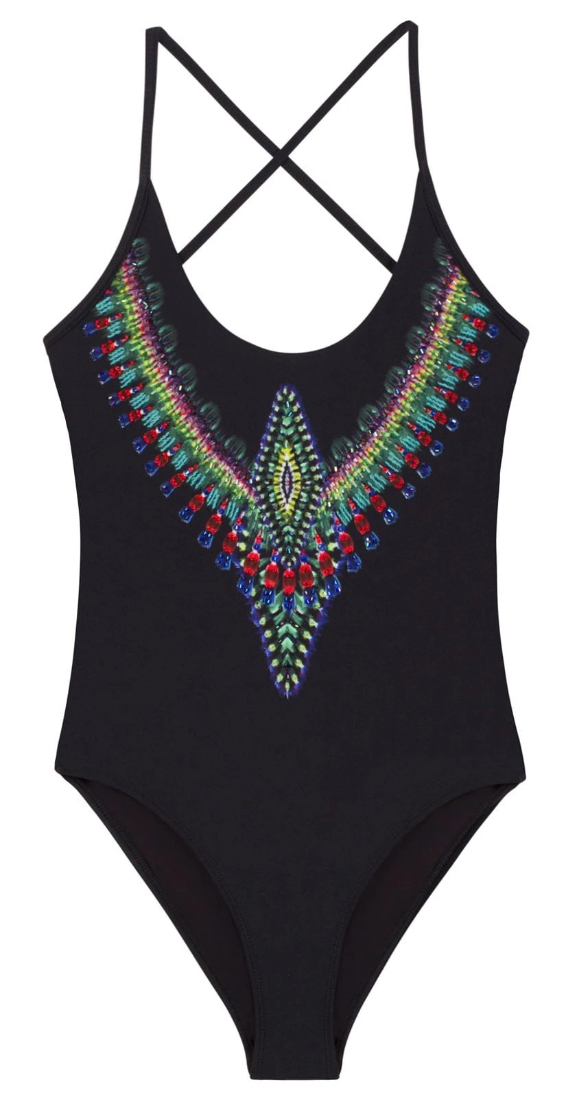 The PilyQ Nile Embroidered Farrah One Piece features an embroidered colorful detail along the front. This suit offers a scoop neck and a cross back detail. This one piece ties at mid back and has a moderate coverage bottom.