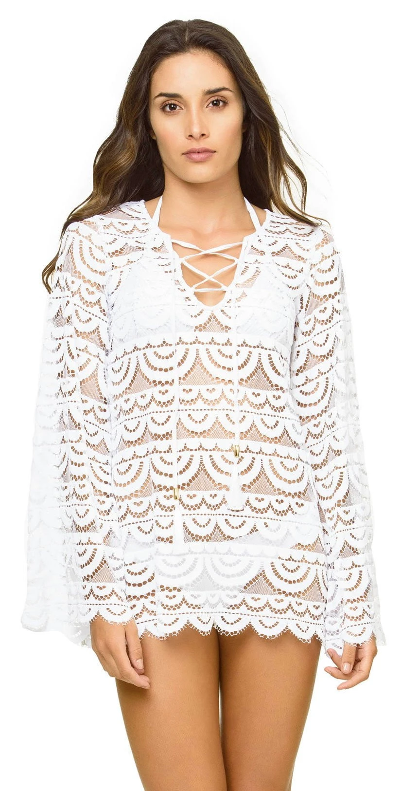 This PilyQ Water Lily White Noah Tunic looks amazing over any of your PilyQ swimsuits! This long sleeve lace cover-up offers the perfect hint of skin with a lace up detail at the bust with gorgeous fringe tassels and a scalloped bottom hemline.