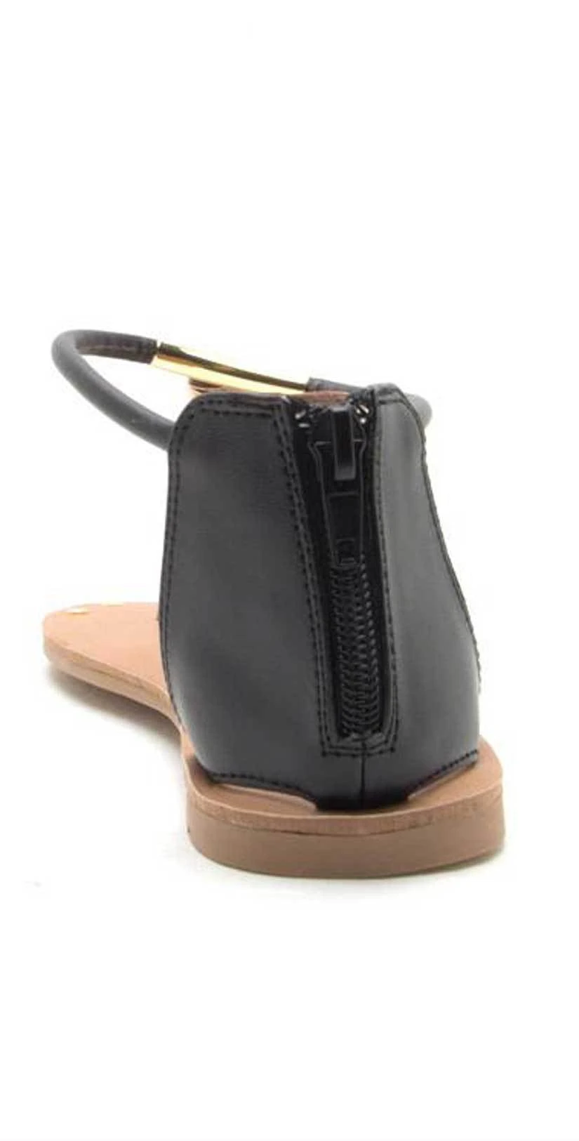The Qupid Shoes Athena Thong Sandal is black and gold accent sandal that has gold metal detail around the thong part of the sandal. This beige and black and gold sandal is a black thong wrapped in gold accents with a zipper back and round gold accents at the front of the sandal.