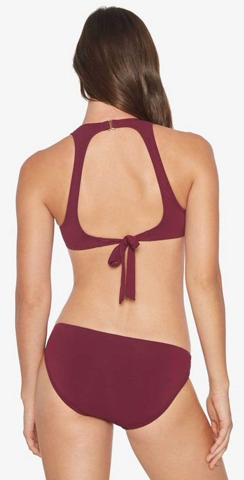 The Robin Piccone Luca Cut Out Bikini Bottom in Rubine is sexy and functional. Featuring gold metal accents with moderate back coverage and cut out details at the hips. Pair with the matching Luca Keyhole Bikini Top in Rubine.