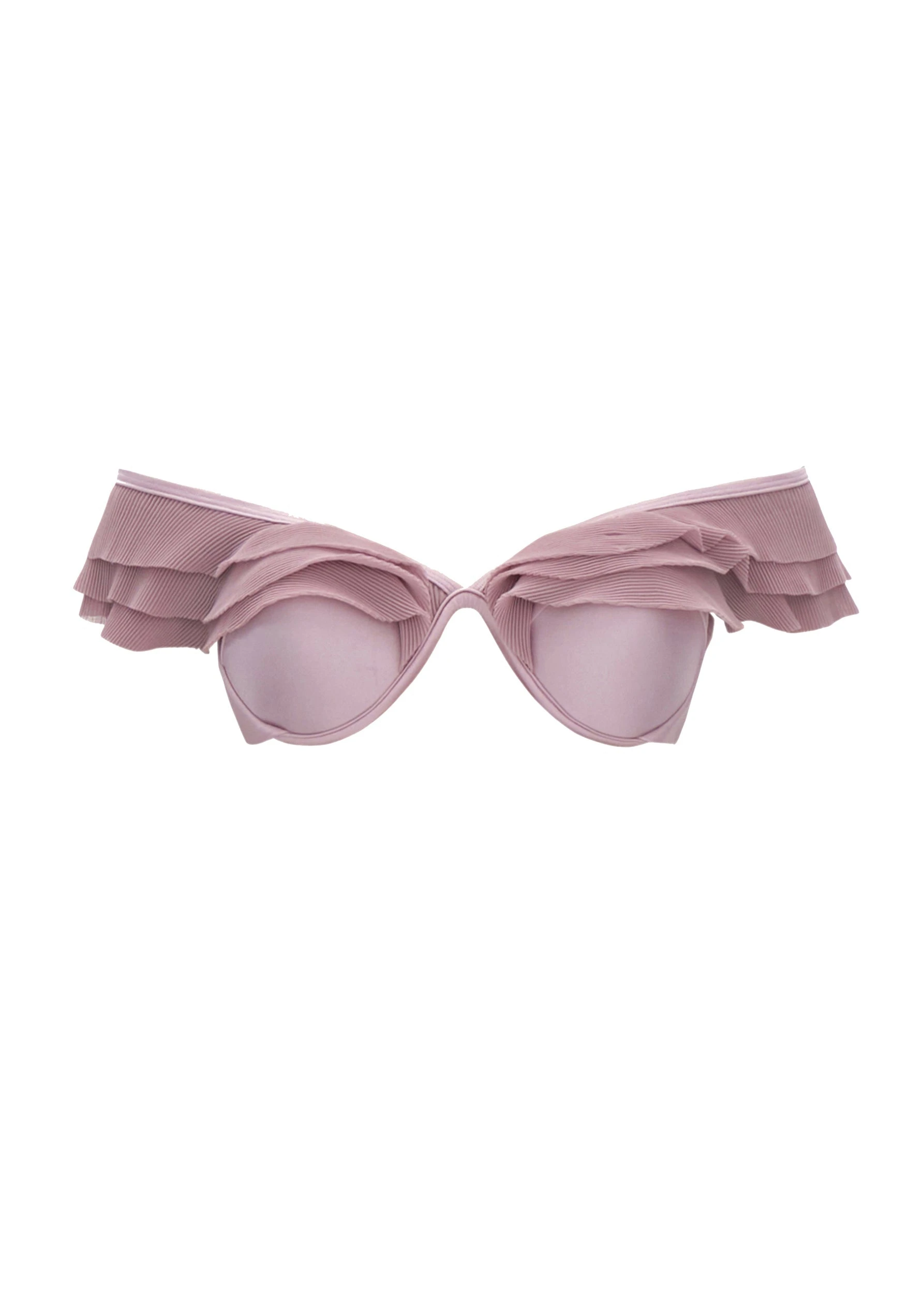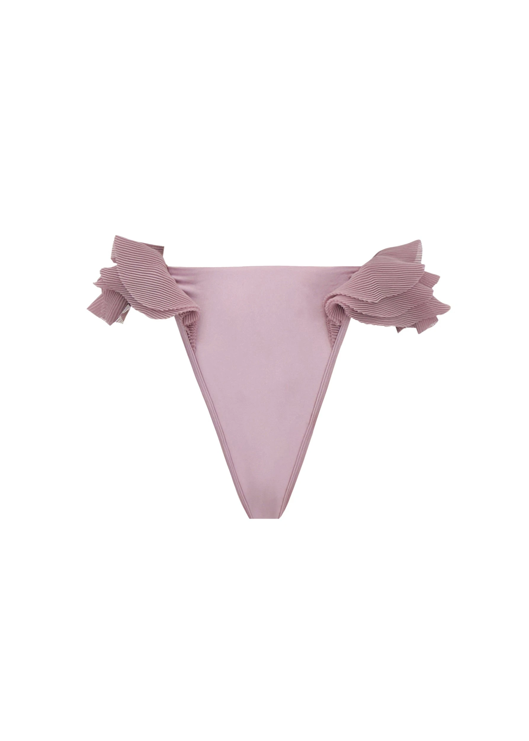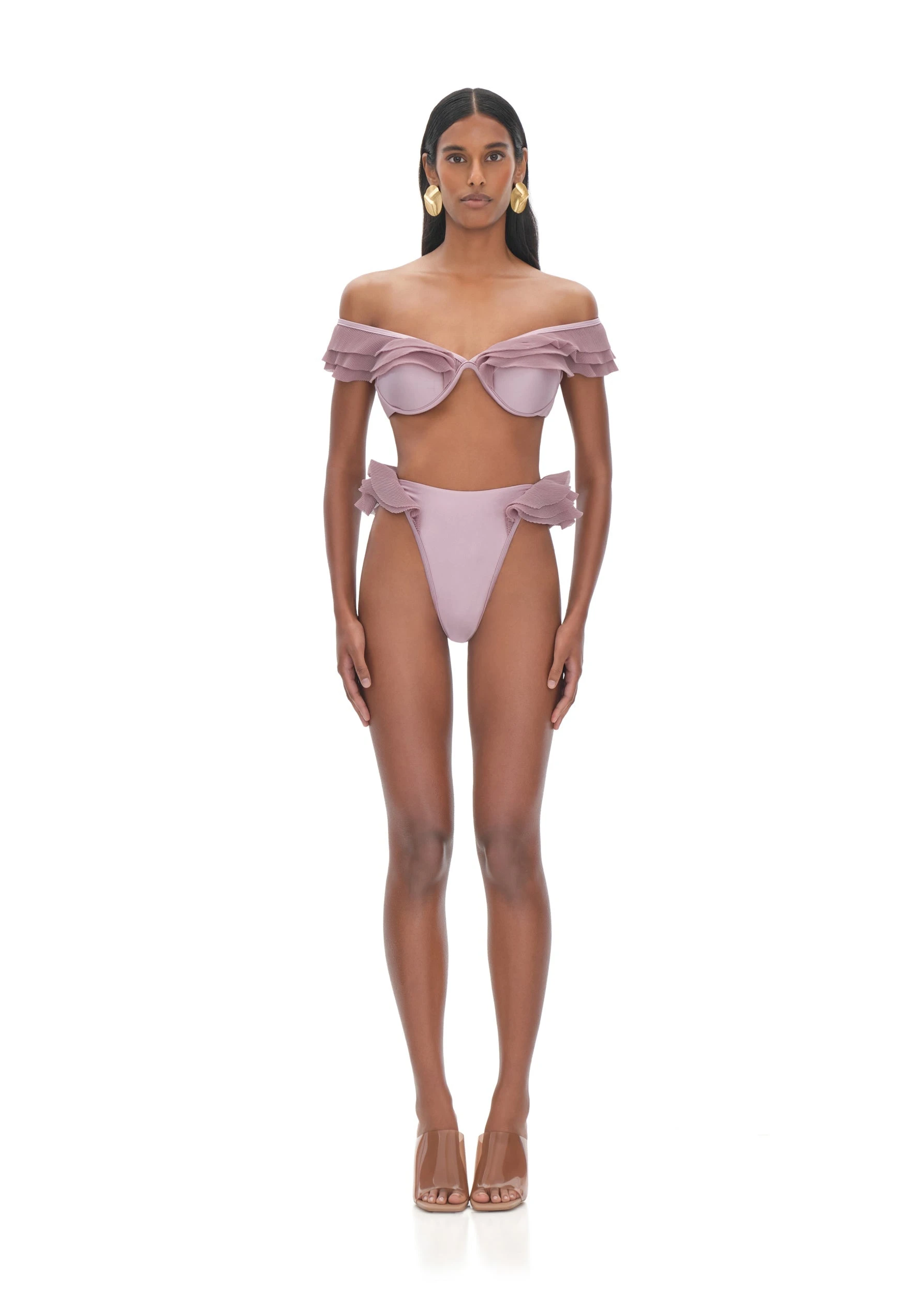 The SALAMA high rise bikini’s beauty lies in its intricacy. It features a 3-tier pleated sheer ruffle that is both textural, soft and feminine. The SALAMA is one our of signature bikini styles featuring a W underwire and adjustable shoulder strap that can be worn in different ways to give multiple looks in one.