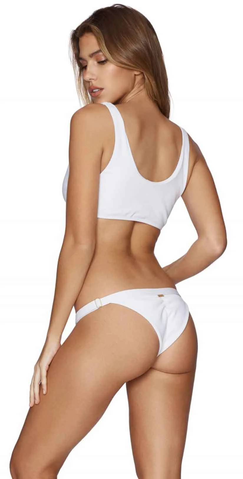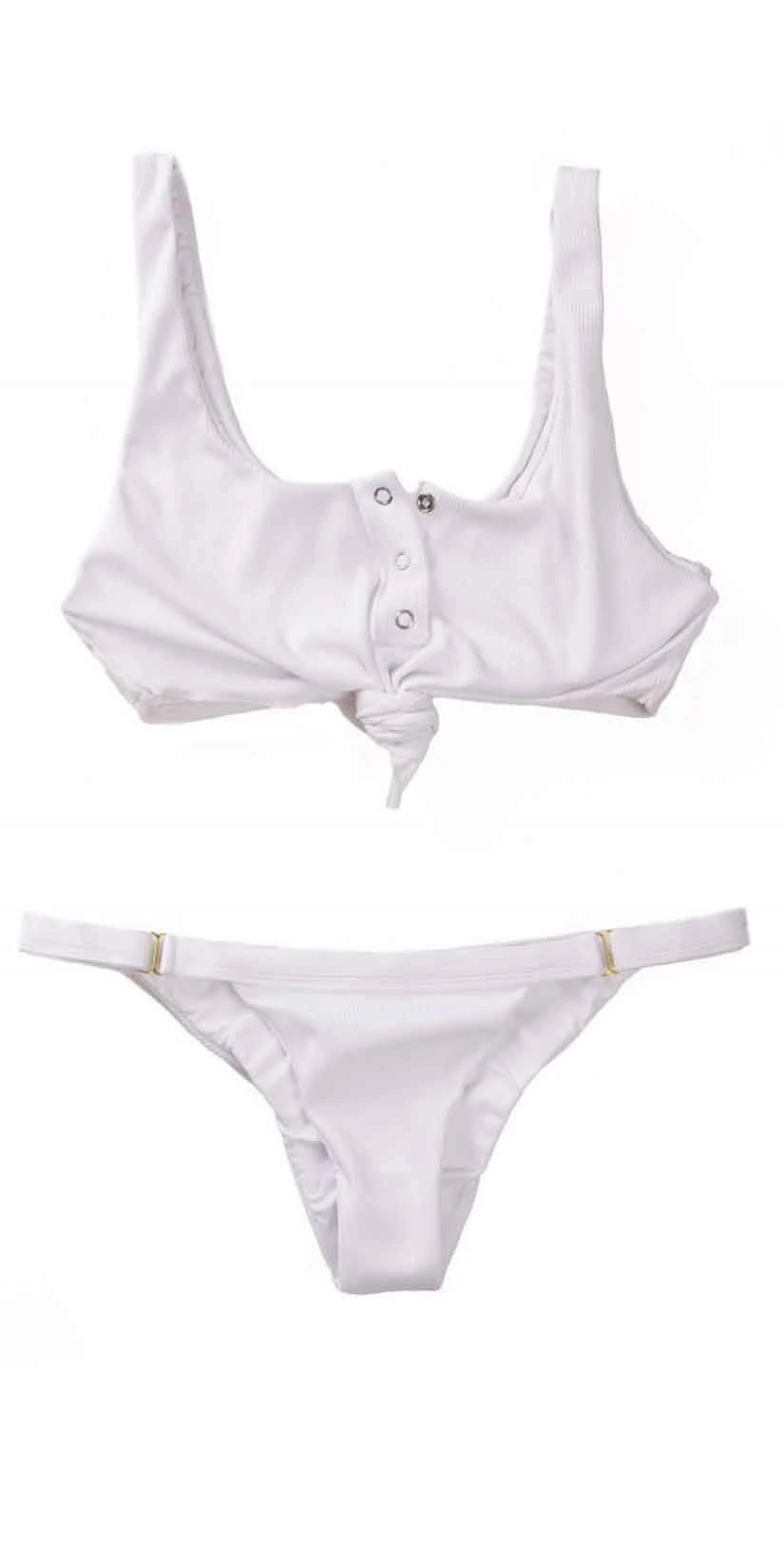 The Beach Bunny Rib Knot Bralette Bikini in White is a faux t-shirt front tie top that looks relaxed yet super sexy. This is a simple front tie white top with snap front buttons and a pullover style that is paired with the Beach Bunny Rib Tide Skimpy.